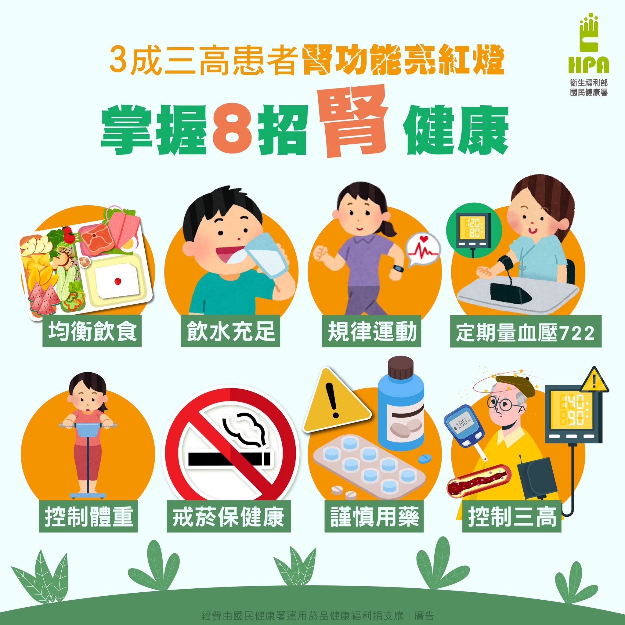 國民健康署除了提供免費成健,鼓勵民眾善加利用外,也呼籲應遵循以下護腎8招: